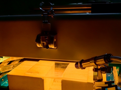 固化PP料無塵裁切可利用聚焦加熱器對半固化PP材料進行加熱,結(jié)合圓刀切割技術(shù)實現(xiàn)無塵裁切。其主要原理是將紅外加熱技術(shù)與傳統(tǒng)的裁切方法相結(jié)合,利用紅外聚焦高溫加熱,穿透力強,加熱速度快,對切割處的半固化片先加熱再裁切,從而減少切割過程中產(chǎn)生的粉塵,解決一直以來困擾業(yè)界的裁切半固化片粉塵及毛邊問題,提高生產(chǎn)效率的同時保證了操作人員的健康。